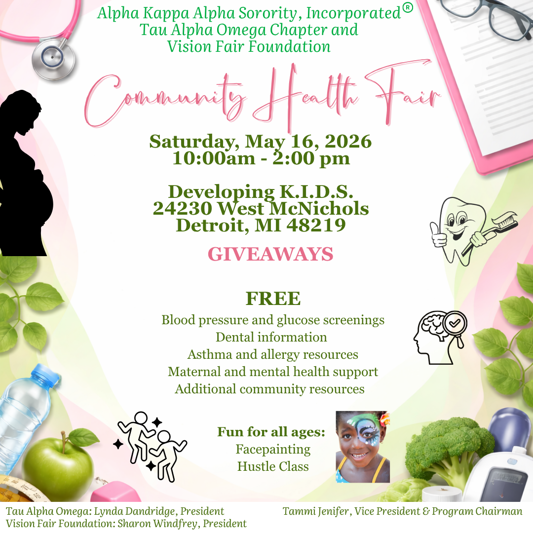 Mark your calendars for a day of wellness and community care at the Tau Alpha Omega Community Health Fair! On Saturday, May 16, the Alpha Kappa Alpha Sorority, Incorporated® Tau Alpha Omega Chapter is bringing together a wide range of local experts and health resources to help you and your family thrive. Hosted at Developing K.I.D.S. in Detroit, this event is your chance to get face-to-face with health professionals, discover vital neighborhood services, and gather the tools you need for a healthier lifestyle. Whether you’re looking for specific health information or just want to connect with your community in a supportive environment, we invite you to stop by, explore the resource tables, and take a proactive step toward your well-being!