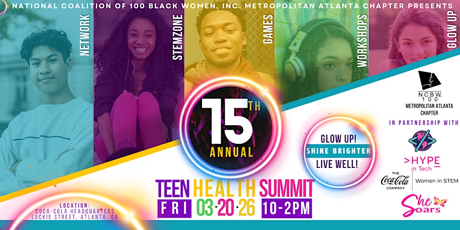 Get ready to "Glow Up" at the 15th Annual Teen Health Summit! Hosted by the National Coalition of 100 Black Women, Inc., Metropolitan Atlanta Chapter, this high-energy event is taking over the Coca-Cola Headquarters in Atlanta for a day of empowerment and wellness. Join us on Friday, March 20, 2026, starting at 10:00 AM. |